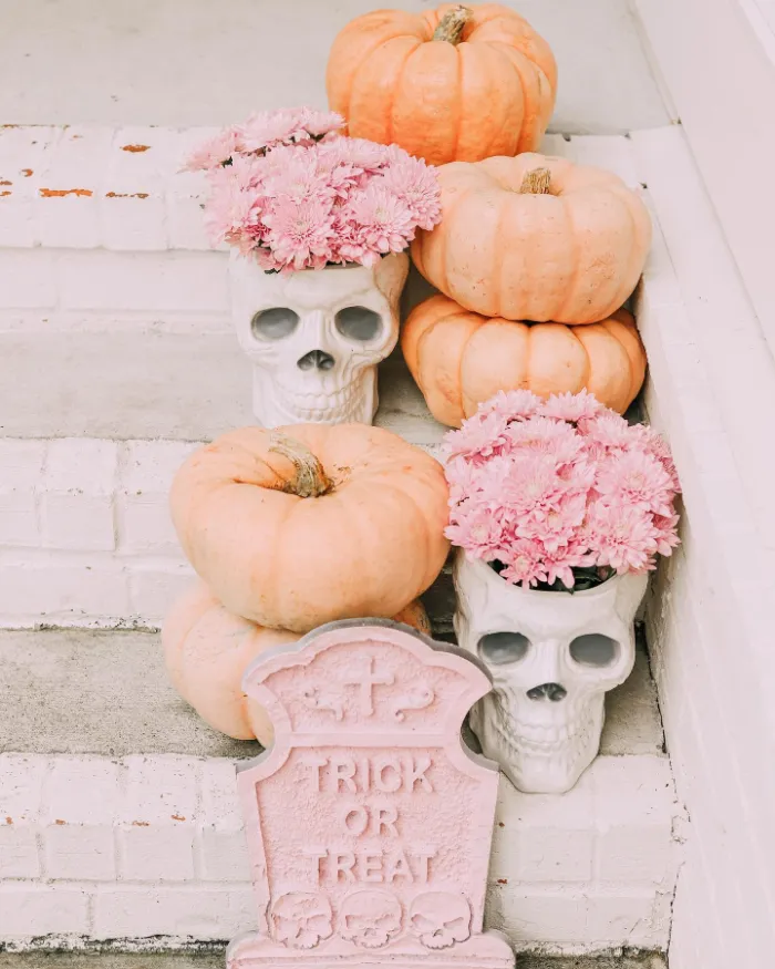 This porch shows that Halloween doesn’t always have to be spooky to be festive. Soft peach pumpkins, pastel pink flowers, and skull planters create a whimsical and playful vibe. Add a pastel “Trick or Treat” sign, and you’ve got a fun look that’s cheerful, family-friendly, and perfect for little ones.