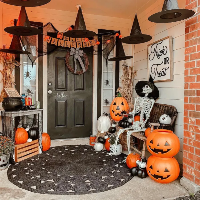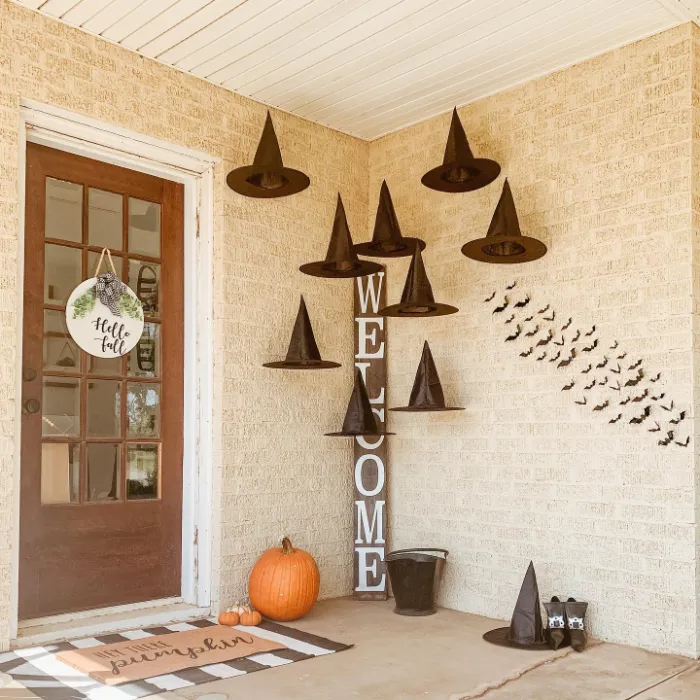 A wall of floating witch hats paired with bats makes this porch feel magical without much effort. The simple pumpkins, welcome sign, and seasonal mat create a playful vibe that’s easy to recreate. It’s a great reminder that a few clever touches can turn a porch into Halloween-ready fun.