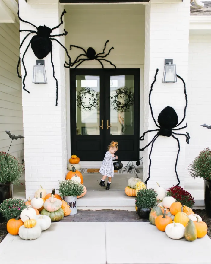 Oversized spiders instantly transform this entryway into a Halloween favorite. With pumpkins in all shapes and colors spilling across the steps, the porch feels festive yet inviting. It strikes the perfect balance of spooky fun and family-friendly style, making it a great way to delight trick-or-treaters without overwhelming little ones.