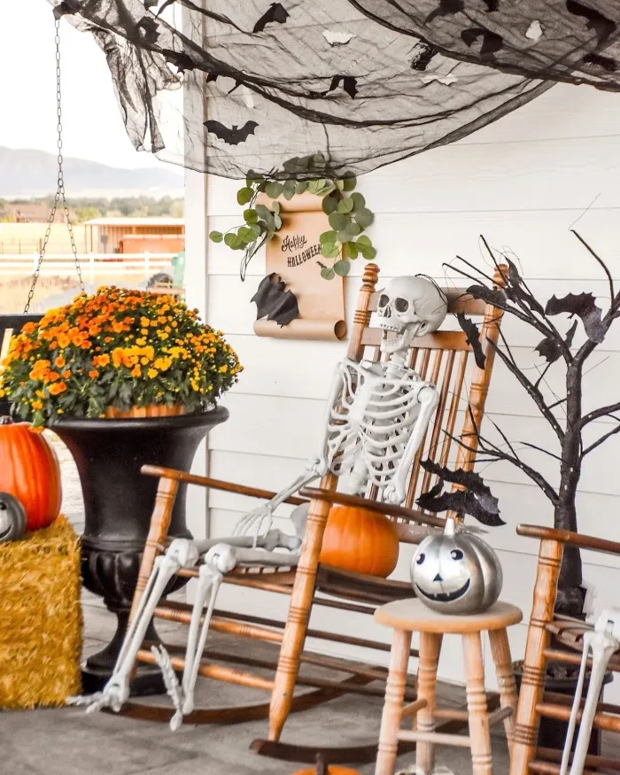 This skeleton has the right idea, sit back and enjoy the season! Rocking chairs, pumpkins, and mums make the porch feel cozy, while bats and black draped fabric add just the right amount of spooky fun. It’s a creative way to combine Halloween excitement with the comfort of fall farmhouse charm.