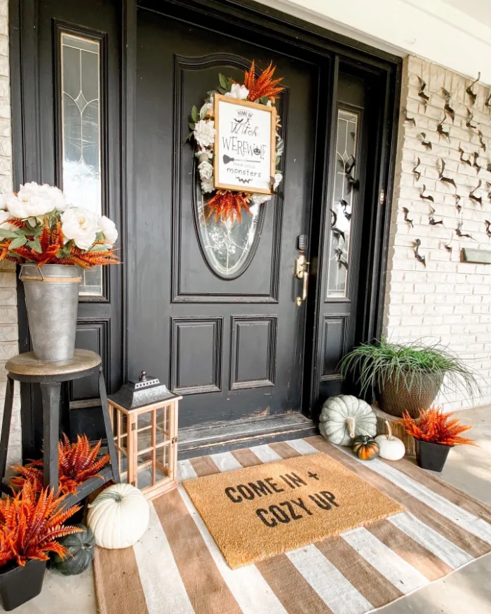 This porch uses warm autumn colors and soft details to bring in a family-friendly Halloween vibe. The doormat, fall florals, and subtle pumpkins say “welcome” while still nodding to the season. It’s the perfect inspiration if you want a cozy front porch that feels festive without being too scary.