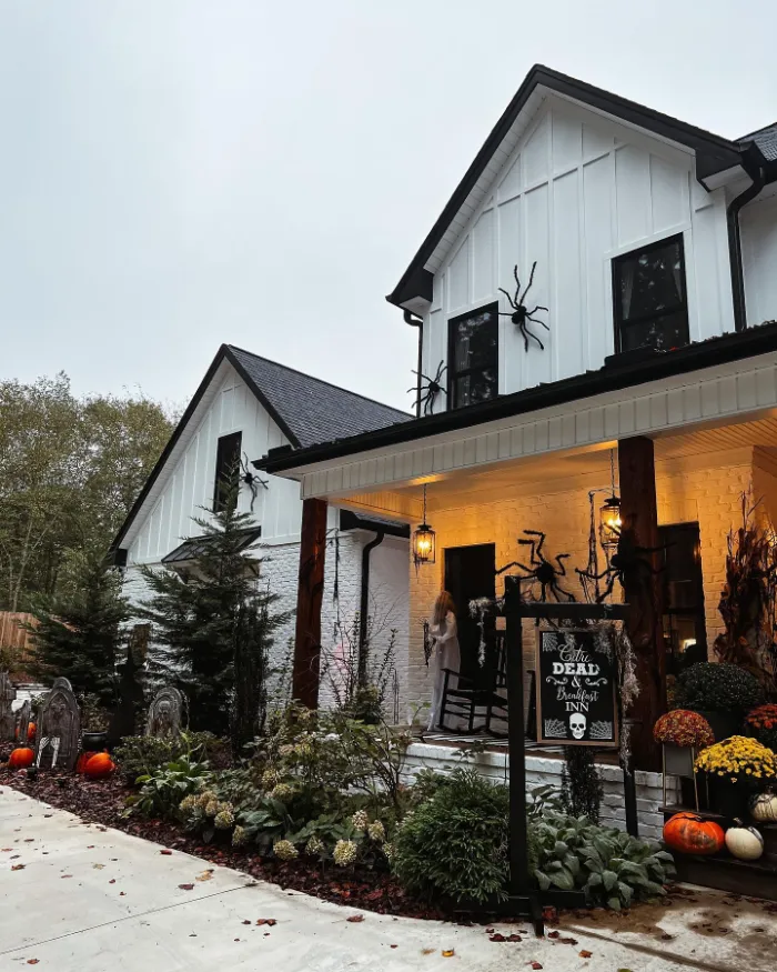 If you love going bold, this house shows how to turn your porch into a statement. Giant spiders, tombstones, and a spooky sign make the whole front yard part of the display. It’s fun, dramatic, and sure to thrill every trick-or-treater who comes knocking on Halloween night.