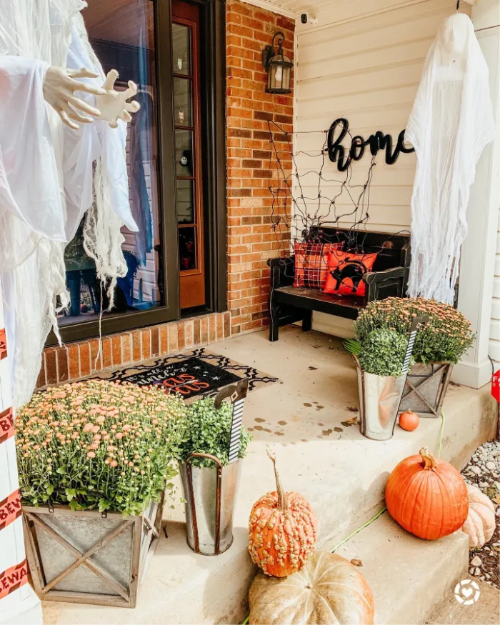 This porch combines friendly ghost decorations with pumpkins and fall florals for a fun mix of spooky and warm. The cozy seating makes it feel inviting, while the playful ghostly figures bring the Halloween spirit to life. It’s just the right balance for families who love fun but not fright.