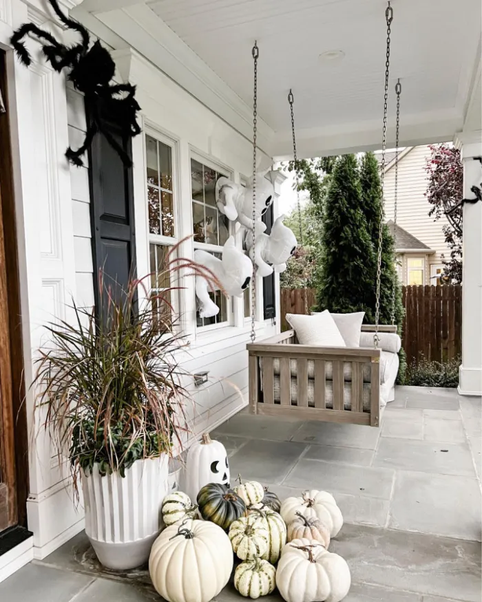 Soft white pumpkins and floating ghost décor give this porch a whimsical Halloween style. The porch swing and fall planters keep it feeling cozy and inviting, while the playful decorations create a lighthearted spooky mood. It’s a great option if you want festive Halloween fun that won’t scare younger kids.
