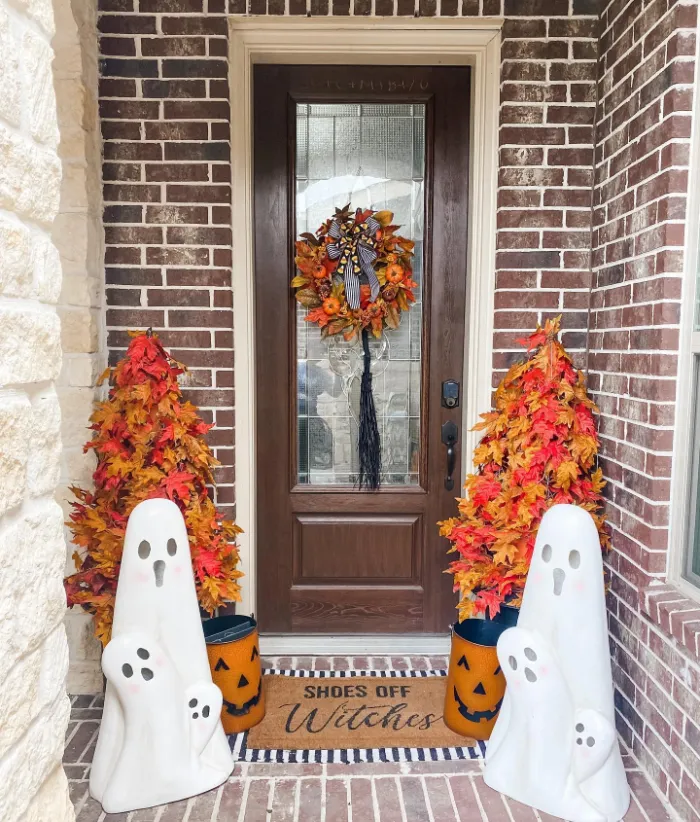Cheerful white ghost statues and bright orange leaf trees make this entryway festive and fun. The doormat that reads “Shoes Off Witches” adds a playful touch that sets the tone right away. With jack-o’-lantern buckets and a fall wreath, it’s an easy and family-friendly way to welcome Halloween visitors.