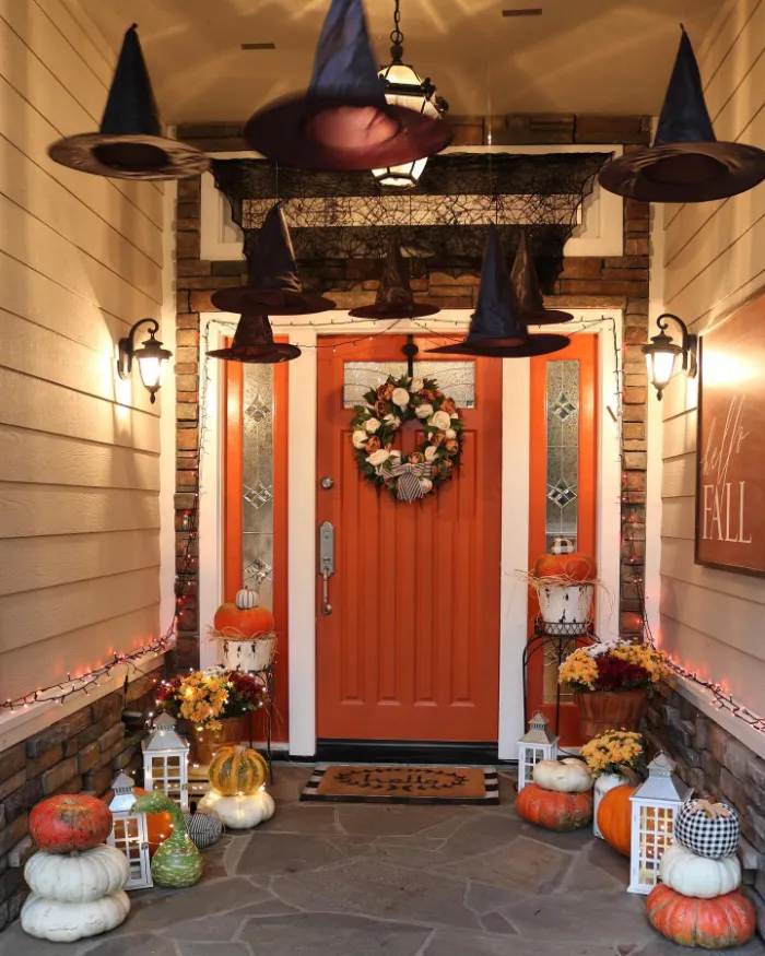 Rows of witch hats seem to magically hover above this bold orange door, making the porch a real showstopper. Paired with glowing lanterns, pumpkins of all sizes, and pretty floral touches, it blends spooky and cozy perfectly. Trick-or-treaters will love the fun atmosphere before they even ring the doorbell.