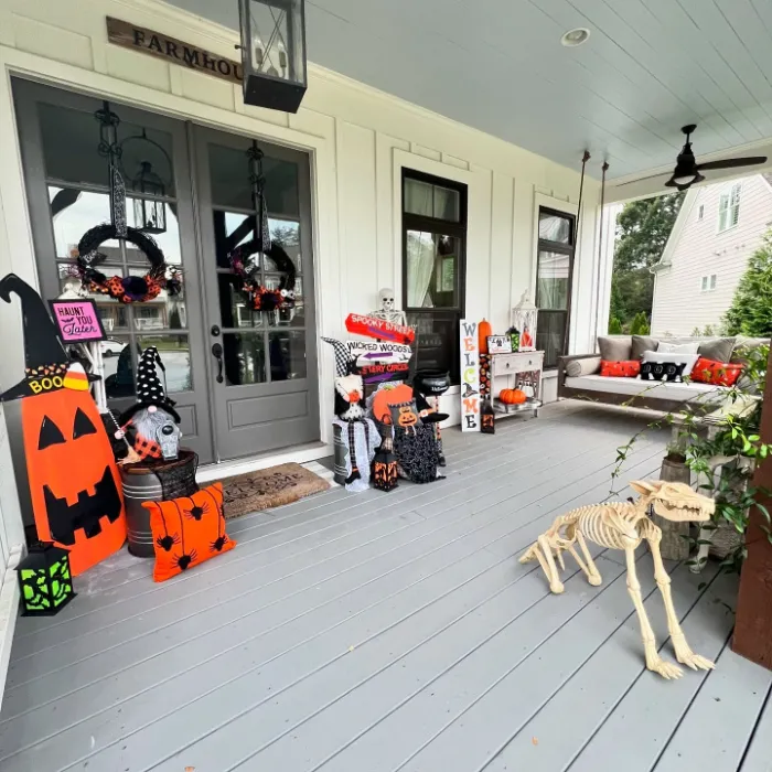 Bright pumpkins, spooky characters, and Halloween pillows bring so much personality to this farmhouse porch. The life-size skeleton pup and colorful welcome signs give it a cheerful look kids will love. Add in the comfy swing, and this space becomes both festive and family-friendly, a perfect spot to enjoy October evenings.