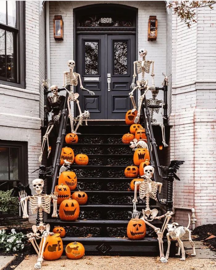 This setup turns an ordinary staircase into a Halloween masterpiece. Skeletons sit, stand, and climb alongside glowing pumpkins, making every step a display of spooky fun. It’s a bold look that’s dramatic yet playful, perfect for families who love going all-in with Halloween decorating and creating lasting memories.