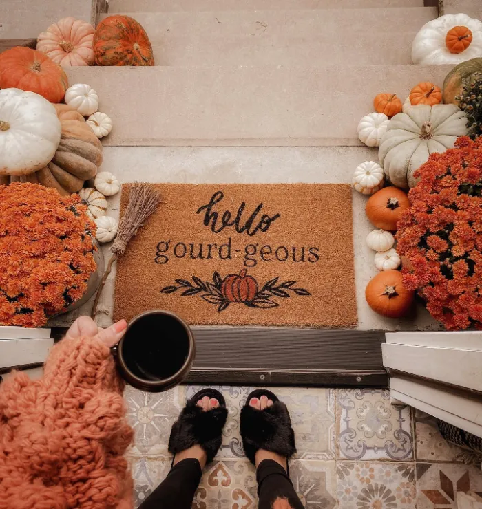 Sometimes it’s the small touches that make the biggest impression. A festive doormat, cheerful mums, and a scattering of pumpkins create a warm welcome that works all season long. Add in cozy textures and a cup of coffee, and you’ve got the perfect spot to enjoy crisp autumn mornings.