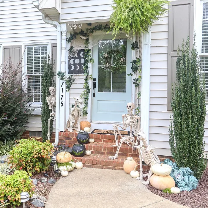 This playful porch scene feels like the skeletons are ready for a family chat. With lush greenery and soft pumpkins around the steps, it strikes a balance of spooky and welcoming. The skeleton pup adds extra charm, creating a setup that’s festive without being frightening for trick-or-treaters.