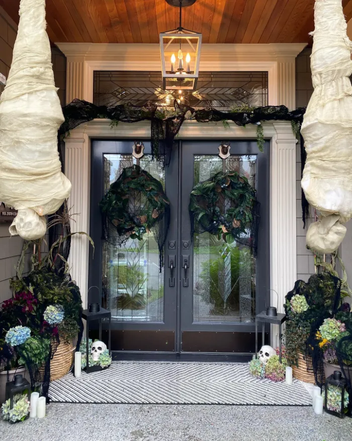 Dramatic wrapped figures hang upside down while skulls, black fabric, and eerie greenery frame the doorway. This bold design is made to impress and maybe spook anyone walking up to the door. It’s perfect for families who love turning their home into a haunted attraction for Halloween night.