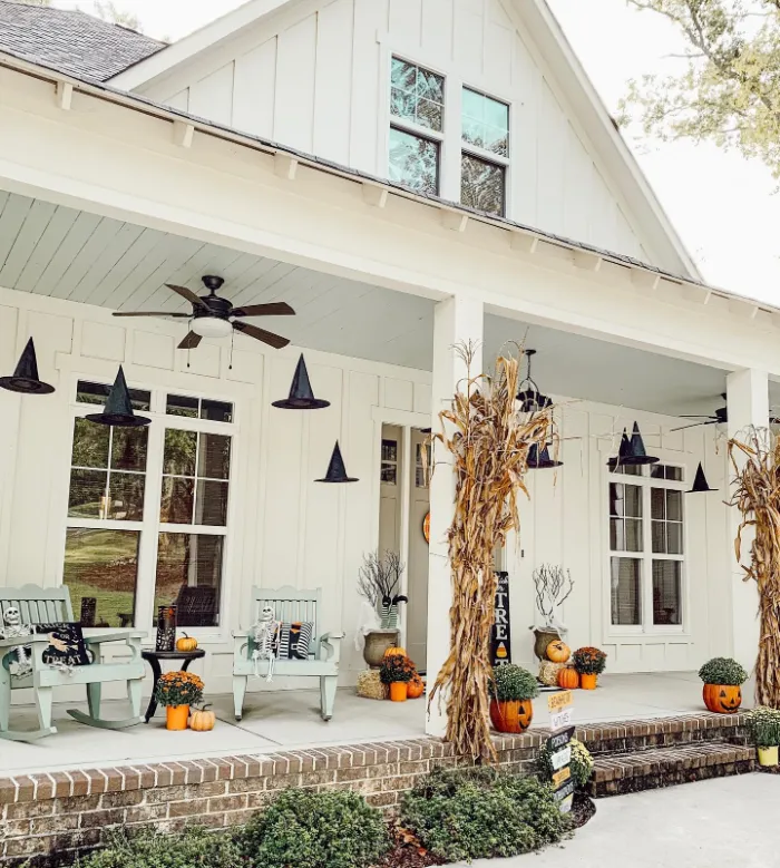 Floating witch hats and tall cornstalks bring rustic charm to this wide country porch. Bright pumpkins and cozy seating keep the look approachable while still feeling festive. It’s an inviting setup that works beautifully for larger homes, offering plenty of space for decorations that make a statement.