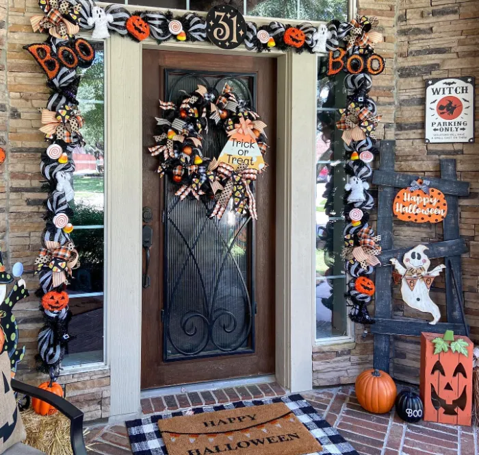 This front door bursts with Halloween cheer bright wreaths, candy-colored garlands, and “Boo” accents everywhere. The playful mix of pumpkins, ghosts, and bold signage makes it fun for kids and eye-catching for neighbors. It’s proof that more can definitely be more when you want a bold, festive porch design.