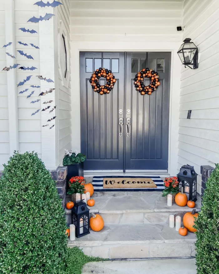 A colony of bats takes flight across this simple but stunning porch setup. Paired with pumpkin wreaths, black lanterns, and glowing candles, the design feels classic yet stylish. It’s the perfect option if you want a minimal look that’s still festive and fun for family and guests.