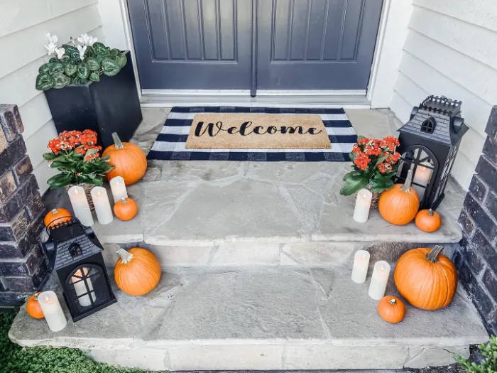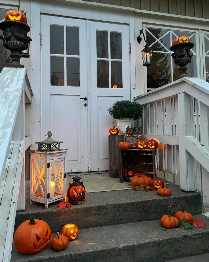 This close-up view shows just how much small details matter. Pumpkins, lanterns, and glowing candles transform plain steps into a festive seasonal welcome. The fresh flowers add a burst of color, keeping the look cheerful as well as spooky. It’s a family-friendly design that’s easy to recreate.