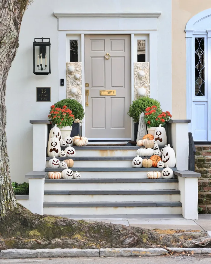 White pumpkins with carved faces line these steps, creating a fresh take on Halloween decorating. Pops of greenery and bright planters keep the look vibrant, while the matching pumpkin expressions make the display cohesive and fun. It’s a whimsical, less-scary option that’s perfect for homes with younger children.