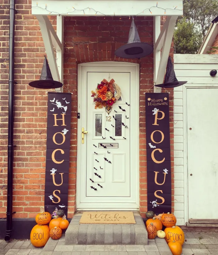 This entryway embraces classic Halloween fun with bold “Hocus Pocus” signs, floating witch hats, and cheerful pumpkins. The bat accents on the door bring everything together. It’s a spirited and theatrical design that celebrates the season with a playful nod to one of Halloween’s most beloved themes.