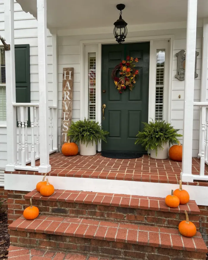 Sometimes simplicity makes the biggest statement. This porch pairs ferns, pumpkins, and a “Harvest” sign with a fall wreath for a look that blends autumn coziness with Halloween charm. It’s a welcoming setup that works well beyond October, carrying the festive spirit through Thanksgiving too.
